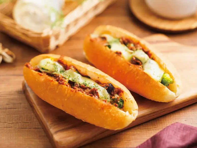 多数ある「おかずコッペ」の中に、寒くなってくると仲間入りするのがこの「茄子&ミート」。ゴロッと入った茄子のやわらかな口どけを感じながら、ミートソースのコク、ブロッコリーの食感と甘みを心ゆくままに味わえる。そのままでもおいしいのはもちろんのこと、ほんの少し温めて食べてみるのもおすすめ。とろけるチーズの旨味が増し、よりやさしい味わいを楽しめる。