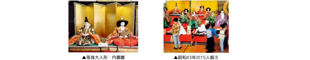 一方、昭和34年に東海節句人形協会会長、同41年静岡県節句人形製造協同組合理事長となり、業界をけん引しました。 そして60を過ぎ、再び等身大活人形への情熱が沸き起こります。 改めて一から学び直すこと4年余。 昭和43年、岡部小学校の講堂で15人飾りが展示され大反響を呼び、浜松の松菱や静岡の田中屋(伊勢丹)でも公開されました。 当時50体近くあった等身大活人形のうち15体の雛人形が今、柏屋で展示されています。